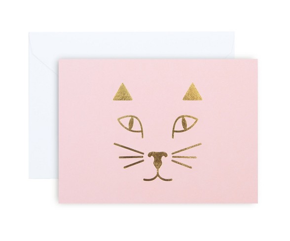 Description Meow! Send a note to friends and family with these purr-fect note cards, featuring a gold foil feline likeness on premium card and envelope stocks. Blank inside.Number of Pieces: 12Dimensions (Overall): 3.5 inches (L) x 4.88 inches (W)Includes: CardsFeatures: Blank InsideDecorative Accents: EmbellishmentPaper Type: Cardstock Estimated shipping dimensions: 3.9INCH X 1.5INCH X 5.2INCH DPCI : 053-07-1460 UPC : 811067012291 TCIN : 51117315 Estimated shippimg weight: 0.4POUND