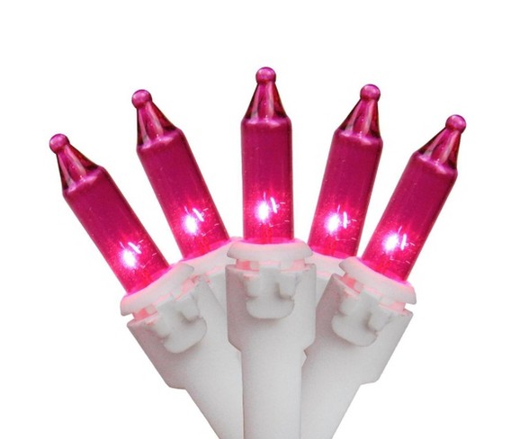 Description Designer Light Series. Features: Color: pink / white wire. Number of bulbs on string: 100. Bulb size: mini. Spacing between each bulb: 6 inches. Lighted string length: 49.6 feet. Total string length: 50 feet. Wire gauge: 22. Additional Product Features: Super bright 2.5 volt bulbs. If one light goes out the rest will stay lit. Lights are equipped with the lamp lock feature, which makes them replaceable, interchangeable and keeps them from falling out. UL listed for indoor/outdoor use. Replaceable bulbs and fuse included. End-to-end connectors allow you to connect up multiple sets of these lights together (not to exceed 210 watts). 120 volts, 60 hertz,.34 amps, 40.8 watts. Material(s): plastic/wire.Overall Length: 600.0 inchesWeight: 1.2 poundsLight Bulb Type: IncandescentLighted length: 600.0 inchesLight Bulb Color: PinkWire Color: White100 Pink Color Lights With White WireSpacing Between Bulbs Is 6 InchesBulbs Are Equipped With Lamp Lock FeatureMeasures: 49.6 Feet Lighted Length Estimated shipping dimensions: 4.0INCH X 12.0INCH X 5.0INCH Estimated shippimg weight: 1.2POUND