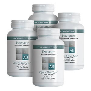 We've combined four of our best-selling products into a hard to beat combination that saves you nearly 20% over purchasing these products separately. The Daily Essentials AB includes: Polyvite® AB - Professional strength multivitamin especially designed by Dr. Peter D'Adamo to deliver therapeutic levels of vitamin and herbal co-factors for your blood type. These are the exact same multivitamin formulas that Dr. D'Adamo uses in his professional practice. Deflect® AB: - This product provides anti-adhesive therapy to lectin sensitive individuals. These ABO specific formulas block the effects of dietary lectins before they cause damage, by providing a source of free blocking carbohydrate. Deflect® promotes digestive health by helping to repair damage from 'avoid' foods. Phytocal® AB: - Designed by Dr. Peter D'Adamo, this product features a unique natural source of calcium: The small red seaweed called "Maerl" found only in the isolated areas off the pristine coast of Northwest Ireland. Synergistic co-factors specific to each blood type's physiology enhance absorption. Polyflora® AB - This formula was especially designed by Dr. Peter D'Adamo to deliver therapeutic levels of blood type friendly bacteria (probiotics) and growth media (prebiotics) specific for your type. These are the exact same probiotic formulas that Dr. D'Adamo uses in his professional practice.