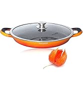 Belle grandeur, parfaite pour l'induction, anti adhésive, grille super bien! Super bien emballée, aucun risque pour le couvercle. Tout petit moins : il faut impérativement utiliser les poignées en silicone fournies, car les anses sont très très chaudes