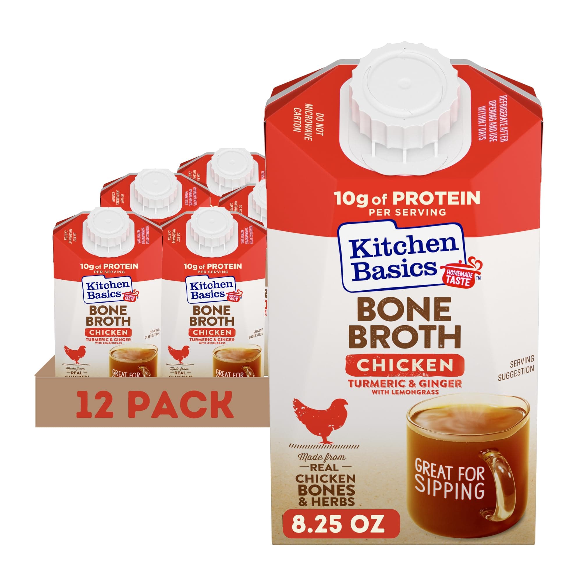 Kitchen Basics Turmeric & Ginger Chicken Bone Broth is a premium, gluten-free broth made from slow-simmered real chicken bones, vegetables, and a blend of turmeric, ginger, and lemongrass. Available in a convenient 12-pack of 8.25 oz cartons, it offers a rich, full-bodied flavor ideal for enhancing soups, sauces, and gravies or enjoyed on its own as a nourishing drink.