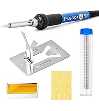 The Plusivo 60W Soldering Iron Kit is a professional-grade, portable electronics toolkit featuring a ceramic heating element with adjustable temperature control, an ergonomic silicone handle, and a dual safety mini stand. Designed for precision and convenience, it includes essential accessories like wire strippers, desoldering pump, tweezers, solder wire, heatshrink tubes, and a comprehensive soldering guide, all housed in a durable, compact storage box perfect for on-the-go repairs and projects.