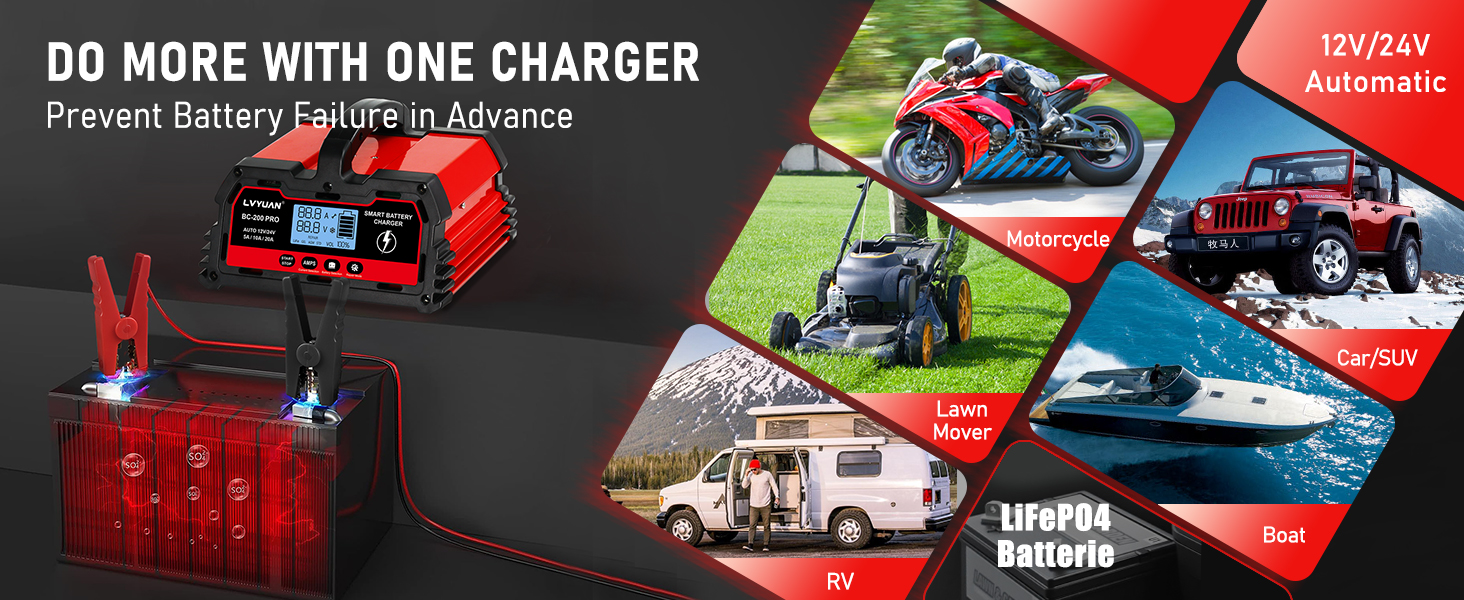 The LVYUAN 12V/24V Smart Battery Charger delivers rapid 20A charging with an intelligent LED display for real-time monitoring. Compatible with a wide range of battery types including AGM, LiFePO4, and lead-acid, it features multi-stage charging and advanced safety protections. Its repair mode revives old or deeply discharged batteries, making it an essential tool for professional-grade vehicle maintenance.