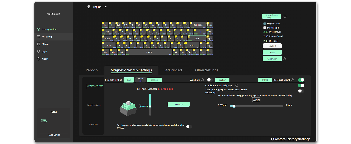 The FUN60 Pro is a wired 60% gaming keyboard featuring an ultra-precise rapid trigger with 0.005mm adjustable actuation, an 8K Hz polling rate for near-zero latency, and compatibility with multiple magnetic switches. It boasts advanced Hall Effect sensors for customizable key response, dynamic ARGB lighting with flicker-free LEDs, and pro-grade functions like DKS and Mod-Tap, making it a top-tier choice for competitive gamers and precision typists alike.