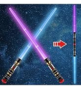 This 4-pack of LED light-up sabers features 4 distinct colors (Red, Purple, Green, Blue) with motion sensor-activated sound effects for an immersive experience. Each saber expands from 18" to 33" for convenient storage and is crafted from durable, eco-friendly plastic. Designed for ages 3 and up, these sabers come with replaceable AAA batteries included, making them perfect for Halloween, cosplay, or epic battles with friends.