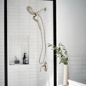 The Moen26009 Engage Magnetix 2.5 GPM Handheld/Rain Shower Head is a versatile 2-in-1 shower solution featuring a cutting-edge magnetic docking system for effortless handheld use. With a powerful 2.5 gallons per minute flow rate, a sleek chrome finish, multiple spray settings, and a 60-inch kink-free metal hose, it combines style, functionality, and flexibility to transform your shower into a personalized spa experience.