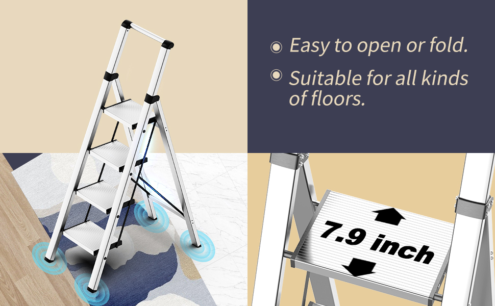 This ladder is perfect for my needs, which is to access items stored on the shelving I've installed above my washer and dryer in the laundry/utility room. It is light and very easy to open, and the steps are nice and deep making you feel very secure. It is meant to be a lightweight utility ladder though, so if you are expecting "heavy duty", you'll probably want to select a different ladder. I ordered the pale gold and it is really cute, but as others have mentioned, mine arrived with a fair amount of scratches. They are not super noticeable and considering mine is in a laundry room I wasn't too worried about it, but if you are planning to use this as shelving, you'll probably be disappointed. The packaging was good and in tact so I'm guessing this is a mfg defect. Overall I am happy with this purchase