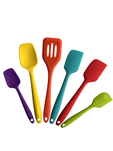 Do you like to have FUN while you're cooking? Then our spatulas are perfect for you. Our HIGH QUALITY, HEAT RESISTANT, ERGONOMIC SPATULAS will bring a smile to your face every time you use them. This beautiful set includes SIX SPATULAS packaged in a gift box. With this set you'll be able to stir, mix, and flip all your food to perfection. The large blue and red spatulas are great for folding doughs, stirring batters, and mixing tasty treats. The large orange spatula is perfect for turning pancakes or flipping burgers on the grill! The large yellow spoon style spatula will scrape batter from a bowl or large jar. The mini green spatula and mini purple spatulas are just the right size to get mayonnaise or jelly out of jar. Made from BPA Free & FDA approved food grade silicone that's dishwasher safe.