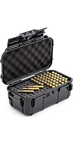 This case has done a great job storing and protecting my ammo from moisture. I store various sizes and the foam interior is very forgiving. The size is comfortable for transporting in a backpack or tote, and design is a durable plastic material. I appreciate the locking mechanism as well.