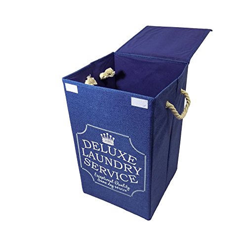 This large laundry hamper features a woven design with a printed vintage sign design consisting of words 'Deluxe Laundry Service, Exceptional Quality, Same Day Service' in white, with a crown above in white, to the front of a plain navy blue woven background. With Velcro opening to the lid and rope handles at either side for easy carrying, this laundry hamper can be folded flat for when not in use. This laundry hamper would make a great addition to any bedroom, utility room etc.