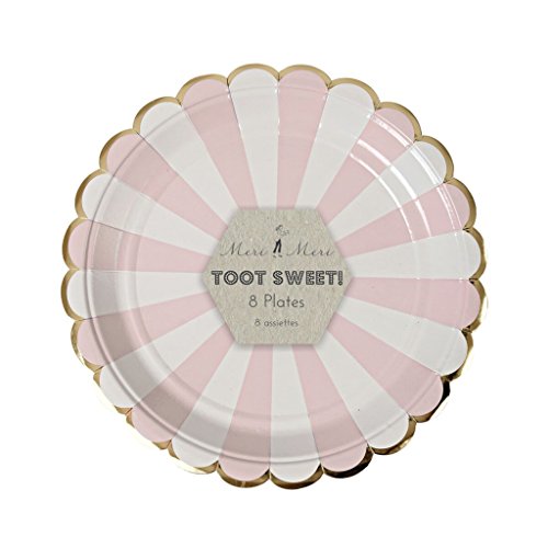 Whether you're celebrating with Mum-To-Be or wanting to add some subtle on-trend colour to your big day, this tableware set is the perfect solution. Each set includes 8 pale pink and white striped plates, with a stunning gold foil scalloped edge. We have other matching tableware available and larger sized plates!. 7 x 7 inch plates