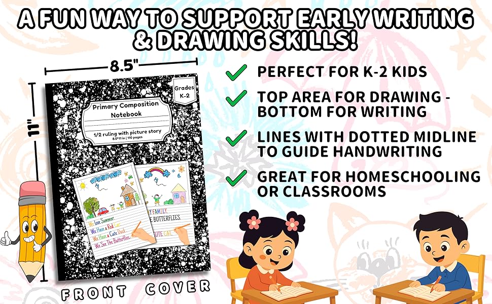 Primary Composition Notebook 1/2 ruling with picture story: Black Primary Writing Journal Grades K-2 with Drawing Space and Dotted midline| ... Draw and Write Journal 8.5 x 11 in|110pages. Paperback – September 8, 2022