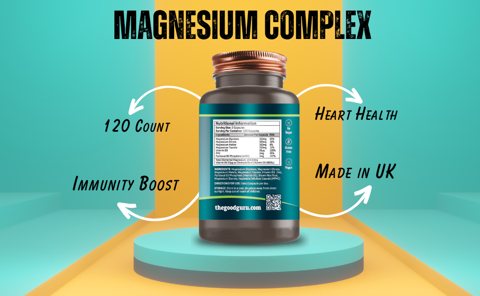 The Magnesium Complex by The Good Guru offers a high-strength 4-in-1 formula with 1400mg of elemental magnesium per serving. This supplement combines Magnesium Glycinate, Citrate, Malate, and Taurate, along with Zinc, to support bone health, boost immunity, and enhance cognitive function. With 120 gluten-free capsules, it's designed for all ages and promotes holistic well-being.