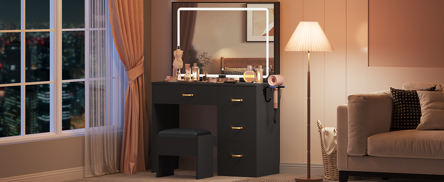 The YITAHOME Dressing Table & Stool Set is a multifunctional vanity desk featuring a large adjustable mirror with three color lighting modes, ample storage with four drawers, and a built-in charging station. Designed for safety and comfort, this stylish black makeup desk is perfect for any bedroom or salon setting.