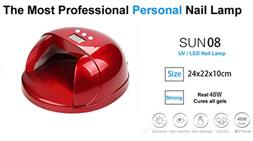 Specification:Color: redInput: 100-240V, 50-60HzOutput: 12VPower: 48W LED UV LAMPTimer: 5s-120s ( Timer can be setting by yourself)Package included:1x 48W LED UV LAMP1x AC ADAPTER1x user ManualFeaturesConnect the power cord with AC/DC adapter, Insert the DC Plug into nail dryer DC interface.Insert power plug into Household power, power indicator lights up, normal electrify.Press the desired timer select, mode indicator lights up , lamp start to work , machine will automatically stop in predetermined time.Lamp has auto-sensing function, if you need to turn on with auto-sensing function ,Please put your hand into machine, lamp will keep working until your hand outstretched.If you want to turn off at working , press the select button again.Backplane can be taken out directly,please remove activities backplane when drying toes.