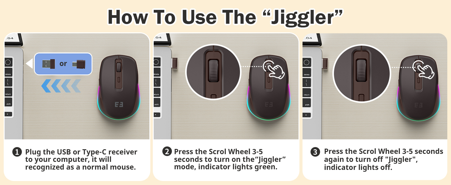 seenda Wireless Mouse with Jiggler - Light Up USB C Mouse, USB&Type C Receiver, Build-in Jiggler Mover Compatible with MacBook,iPad,Windows Tablet/Laptop/Computer, Brown