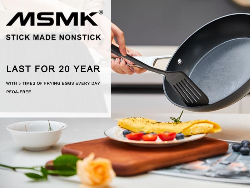 I wish MSMK made a complete pot and pan set like this fry pan. Lightweight, cooks evenly, definite non stick and easy clean up. It sits flat on my Induction stove - a lot of cookware doesn't even with a "flat bottom". I bought as a mas gift for my husband. It is HIS - used for his eggs and has browns and ham. He calls it his breakfast pan. Would buy a whole pot n pan set!