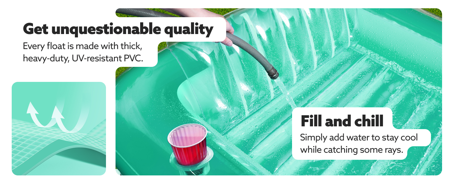 The Sloosh Inflatable Tanning Pool Lounge Float is a spacious 70" x 46" heavy-duty, UV-resistant PVC float designed for adults seeking premium comfort and versatility. Featuring a removable pillow, ribbed air cushion base, two cup holders, and a wrap-around rope for stability, it doubles as a suntan tub when filled with water, ensuring you stay cool while tanning. Perfect for pool parties, personal relaxation, or even as a kids’ ball pit, this float combines durability with stylish functionality.