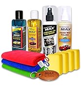 The MAX Complete Car Care Kit offers a curated set of 5 x 200ml premium cleaning, washing, conditioning, and polishing liquids, paired with a high-density 350 GSM microfiber cloth, 3 foam applicators, and a leather keychain. Designed for comprehensive vehicle maintenance, it ensures crystal-clear windshields, long-lasting paint protection with carnauba wax, and a showroom-worthy finish—all in one compact, easy-to-use package made in India.